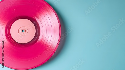 Vivid pink vinyl record against a pastel blue background presents a contemporary, minimalist, high-angle shot.