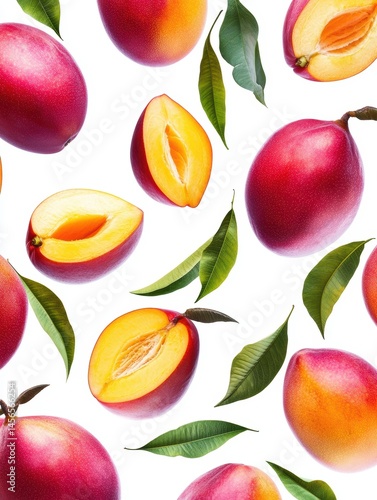 Vivid Plum Still Life on White Background Fresh Fruit Halves and Whole Plums with Green Leaves Overhead Shot Food Photography