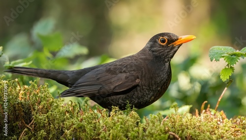 Vivid Portrait of a Common Blackbird Amidst Lush European Vegetation, Captured in Soft Natural Light at Dawn.
