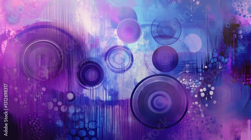 vivid purple and blue abstract design with floating circles and geometric patterns, dynamic and futuristic, artistic and playful composition