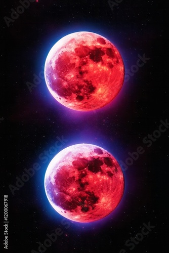 Vivid red moons with a cosmic glow symbolize the mystery of lunar eclipses, ideal for Halloween themes, in a vibrant celestial style