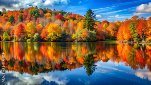 Vivid reflection of autumn forest in calm lake water