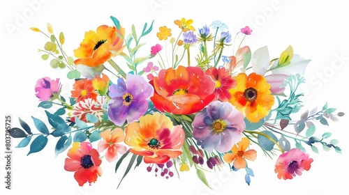 Vivid watercolor illustration of a bouquet of mixed spring flowers, bursting with colors to create a cheerful atmosphere in the clinic