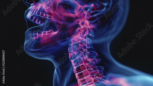 Vivid X-ray image of a human skull and neck with blue and pink hues on a black background, AI generated