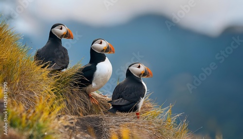 Vividly Colored Horned Puffins Gathering on Rocks amidst the Arctic Beauty of Lake Clark National Park, Alaska, in a Stunning Winter Landscape.