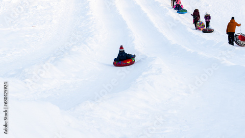 Vladimir, Russia, January 04, 2022: Happy people ride from a snowy mountain