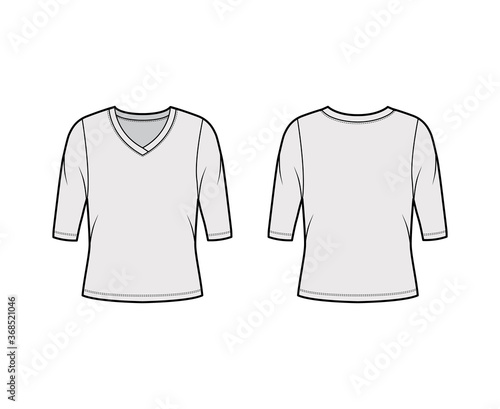 V-neck jersey sweater technical fashion illustration with elbow sleeves, oversized body. Flat outwear apparel template front, back grey color. Women, men unisex shirt top CAD mockup