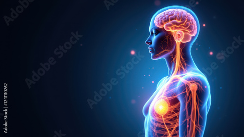 VNS illustration featuring a human body with highlighted brain and nerve pathways against a dark background.