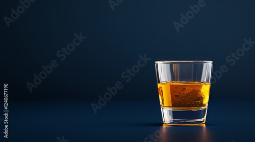 Vodka poured into a shot glass against a dark blue background, leaving ample space for text.