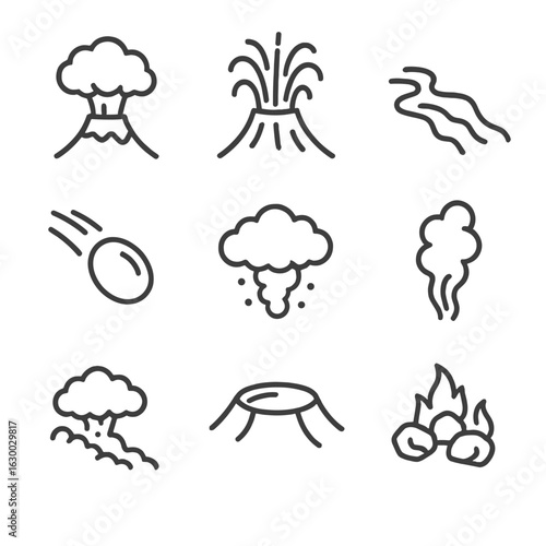 Volcanic Activity Icons. Outline icon set of volcanic activity signs: eruption cloud, lava fountain, magma flow, volcanic bomb,