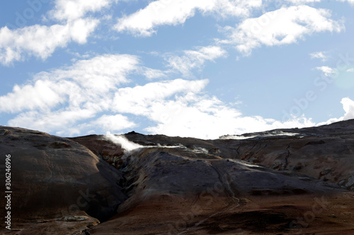 Volcanic area in Iceland. Boiling mudpots in the geothermal area Hverir and cracked ground around. Location: geothermal area Hverir, Myvatn region, North part of Iceland, Europe