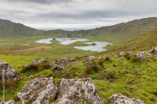 Volcanic crater (Caldeirao) with a beautiful lake on the top of Corvo island. Azores islands, Portugal.
