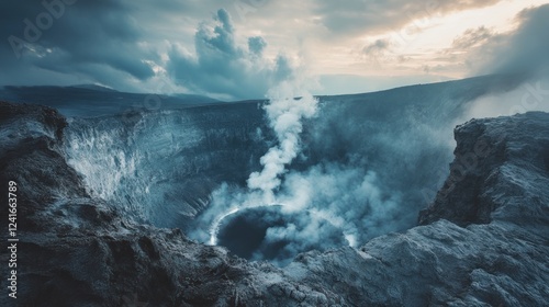 Volcanic Crater's Breathtaking Majesty: A Dramatic Landscape of Smoke and Stone