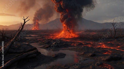 Volcanic eruption landscape, fiery lava flow, dark ash, scorched earth, dramatic sunset