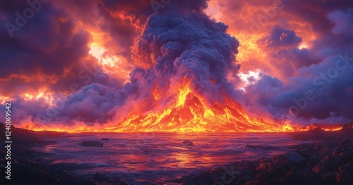 Volcanic Eruption with Ash Clouds and Lava Flow at Twilight