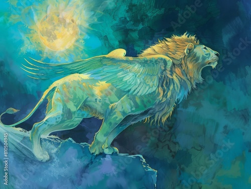 Volcanic eruptions bring fiery destruction, lunar lion soars with wings of RNA, under a sky of vivid blues and greens.