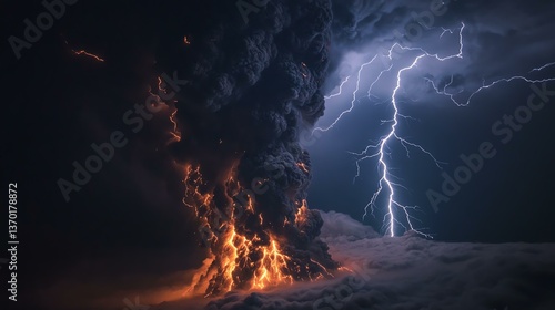 Volcanic thundercloud A dramatic volcano eruption with lightning illuminating the dark clouds and ash.
