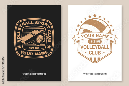Volleyball club flyer, brochure, banner, poster. Vector. For sport club emblem, sign, logo. Vintage monochrome label, sticker, patch with volleyball ball and referee whistle silhouettes.