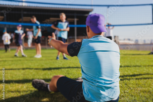 Volleyball game, junior teenage school team of kids play volleyball, players on the outdoor playground with net and green lawn grass court, sports children team during the game, summer sunny