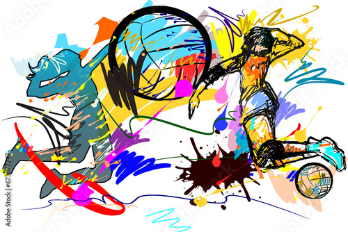 volleyball player jump over net hit balls and brush style