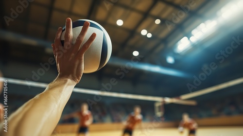 Volleyball player's hand about to serve the ball during a dynamic indoor game with teammates blurred in the background competitive sport action, Generative AI.