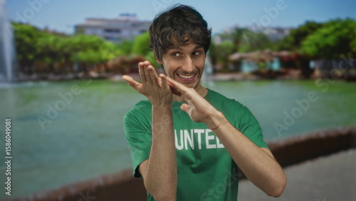 Volunteer man in green shirt holds up hands by water fountain in city street during community cleanup event; optimism.