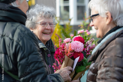 Volunteer receiving flowers from a community group, genuine smiles and thankful expressions all around