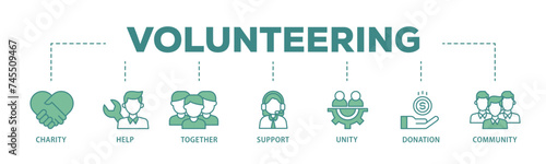 Volunteering banner web icon illustration concept with icon of charity, help, together, support, unity, donation, and community icon live stroke and easy to edit