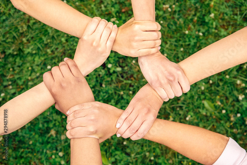 Volunteering. Young people volunteers outdoors together holding hands unity top view close-up