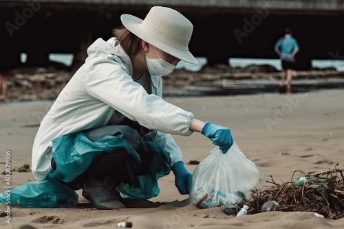Volunteers cleaning the beach from litter, generative ai