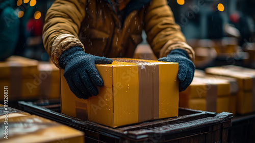 Volunteers preparing donation boxes for a charity drive. bright lighting, contrast