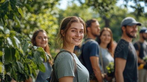 Volunteers smiling while planting trees in a community garden on a sunny afternoon. Generative AI