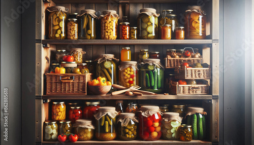 Vorratsregal mit frisch eingemachtem Obst und Gemüse, Einkochzeit