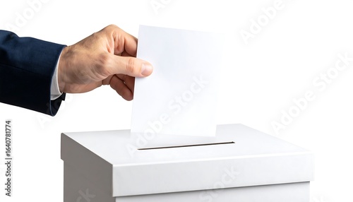 Voting Hand Dropping Ballot in Box Election Concept with White Background.