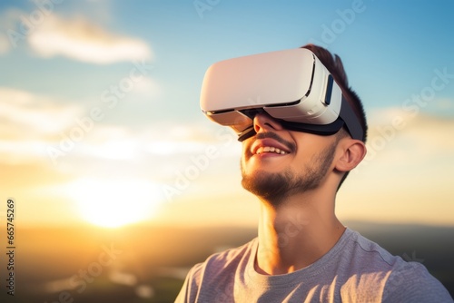 vr augmented virtual experience 3d digtal cyber world cheerful exited male man wear vr headset enjoy technology future entertainment lifestyle