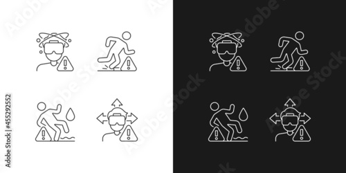 VR headset warning linear manual label icons set for dark and light mode. Customizable thin line symbols. Isolated vector outline illustrations for product use instructions. Editable stroke
