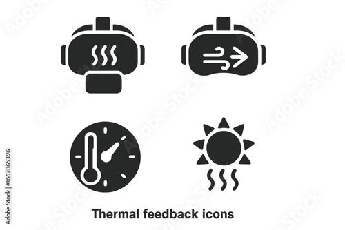 VR thermal feedback solid icons set. Virtual reality haptic technology glyphs. Includes heat patch, cool breeze, temperature dial, and warm sun vector illustrations.
