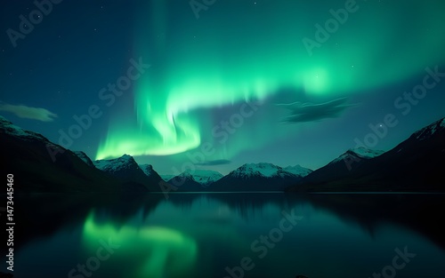 V-Shaped Aurora Borealis over a Calm Mountain Lake at Night. High quality