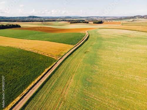 Vue aérienne d'une route dans la campagne traversant les prés et les champs. Paysage rural français. France rurale. La campagne en été. col du poirier Vosges