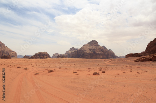 Wadi Rum desert panorama with dunes, mountains and sand that looks like planet Mars surface, Jordan