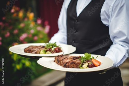 Waiter carrying plates with amazing meat dish. Catering service concept