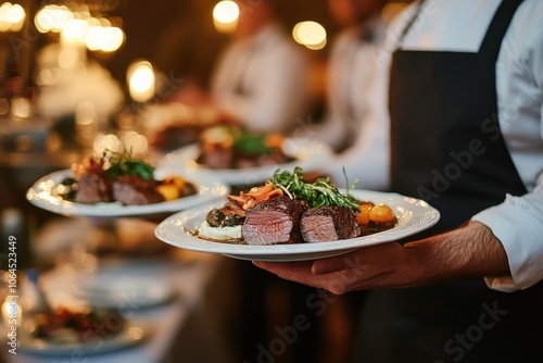 Waiter carrying plates with meat dish on some festive event, party or wedding reception restaurant