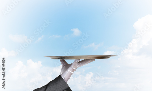 Waiter holding empty silver platter ready for product or item placement