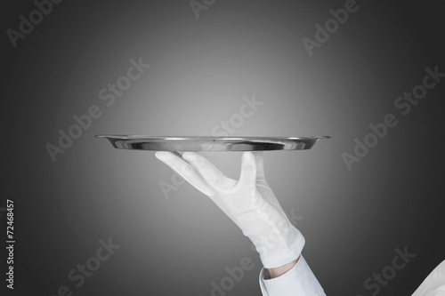 Waiter's Hand Holding Tray Over Gray Background