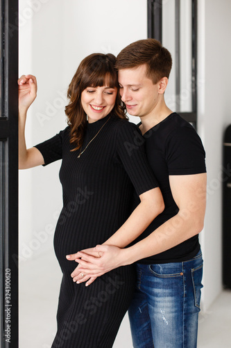 Waiting for baby, mammy's belly. Pair of future parents.Pregnant woman in romantic black dress hugging her belly with hands. Black and white stylish interior. Elegant and pretty woman waiting for baby