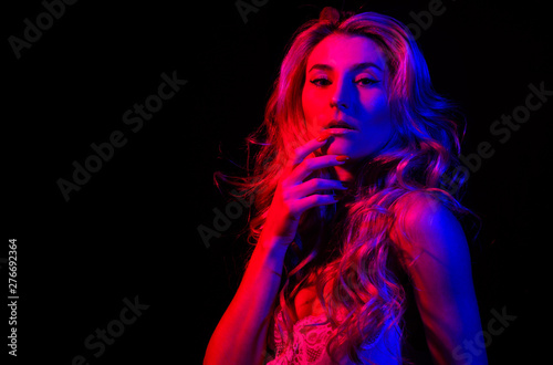 Waiting for him. Pin up woman in bodysuit. Blond curly hair. Pinup look. Sensual girl in red light. Sexy woman in erotic lingerie. Fashion portrait of woman. Makeup cosmetics and skincare