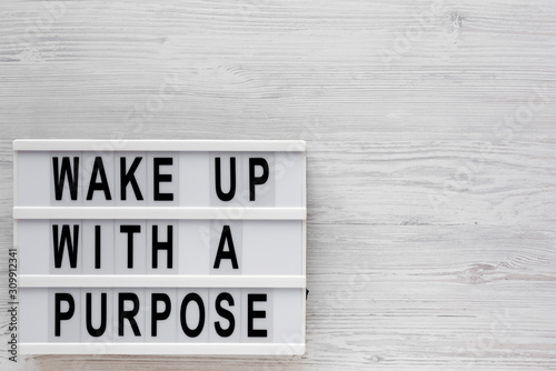 'Wake up with a purpose' words on a lightbox on a white wooden surface, top view. Overhead, from above, flat lay. Space for text.