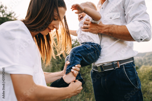 Walk beautiful young family in white clothes with a young son blond in mountainous areas with tall grass at sunset. Mother keeps son in her arms, hugging. family - this is happiness