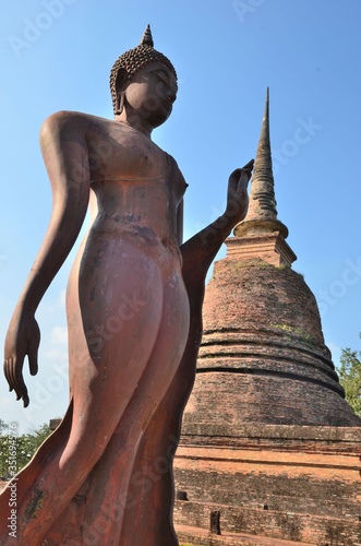 Walking Buddha sculpture seems to push a chedi in the historical park of Sukhothai
