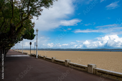 Walking on beach promenade in Arcachon, vacation destination town on Atlantic coast with beatiful parks, villas, streets and sandy beach, France